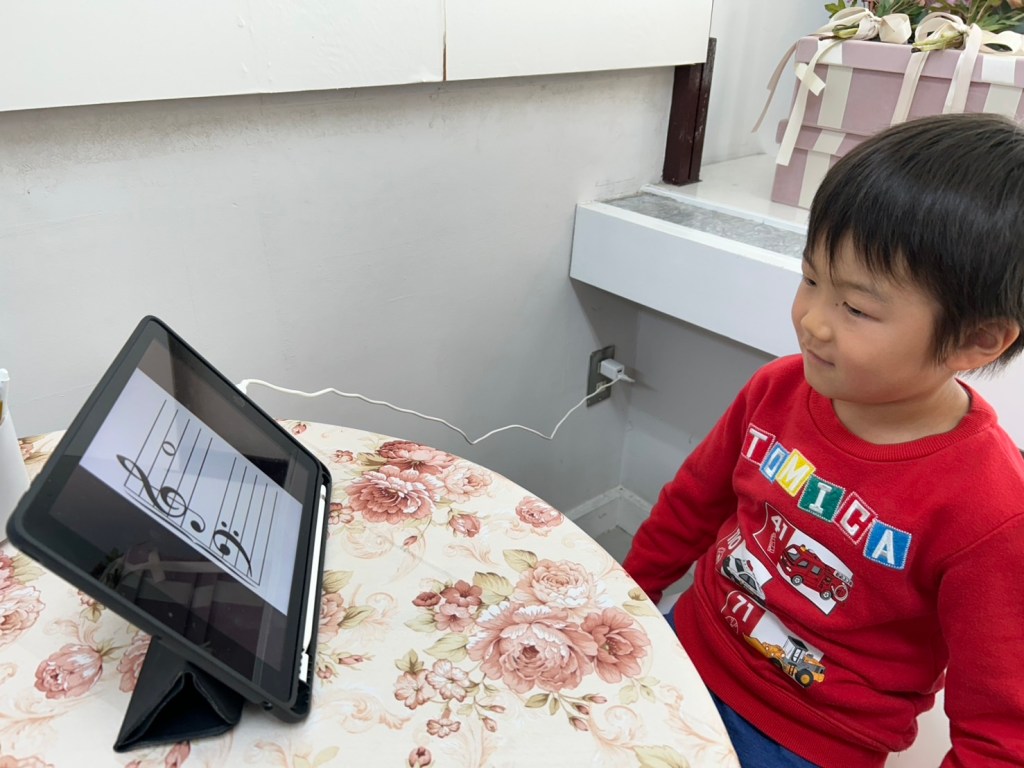 小さいお子様のレッスンではピアノはもちろん、タブレットを使用した音読み、リズム打ち、音取りなど、ソルフェージュも組み合わせています。